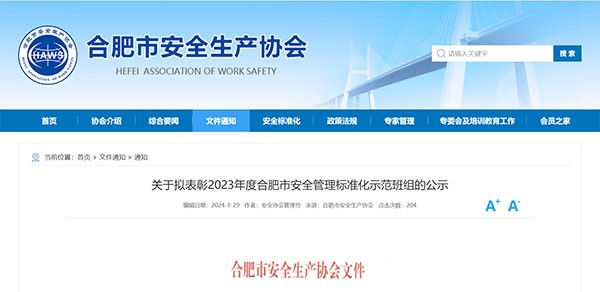 通威太陽能安徽公司榮獲“合肥市安全管理標準化示范班組”榮譽稱號