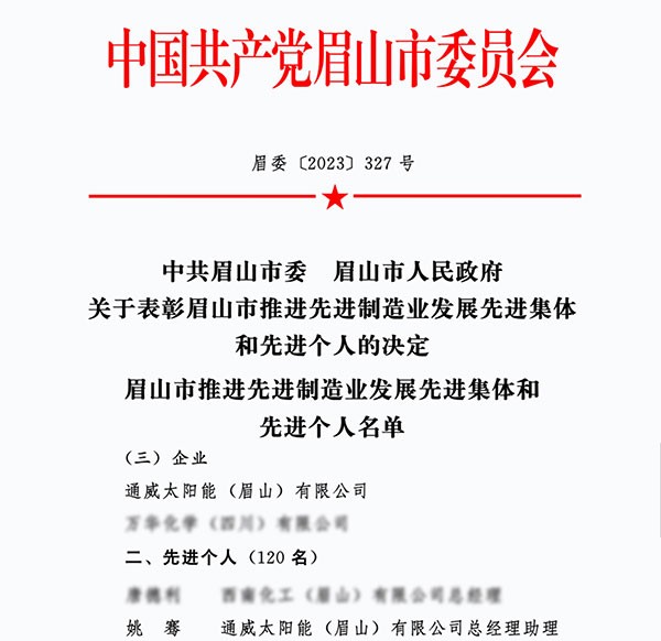 通威太陽(yáng)能眉山基地及黨總支書記姚騫分別榮獲“眉山市推進(jìn)先進(jìn)制造業(yè)發(fā)展先進(jìn)集體、先進(jìn)個(gè)人”稱號(hào)