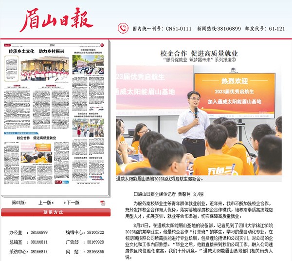 《眉山日報》聚焦通威太陽能眉山基地“校企合作”優秀典型案例
