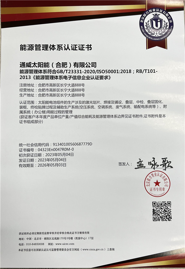 通威太陽能(合肥)有限公司 榮獲ISO50001能源管理體系認證證書