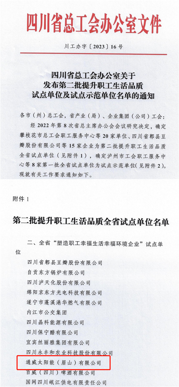 通威太陽能眉山基地獲評四川省“塑造職工幸福生活幸福環(huán)境企業(yè)”試點單位