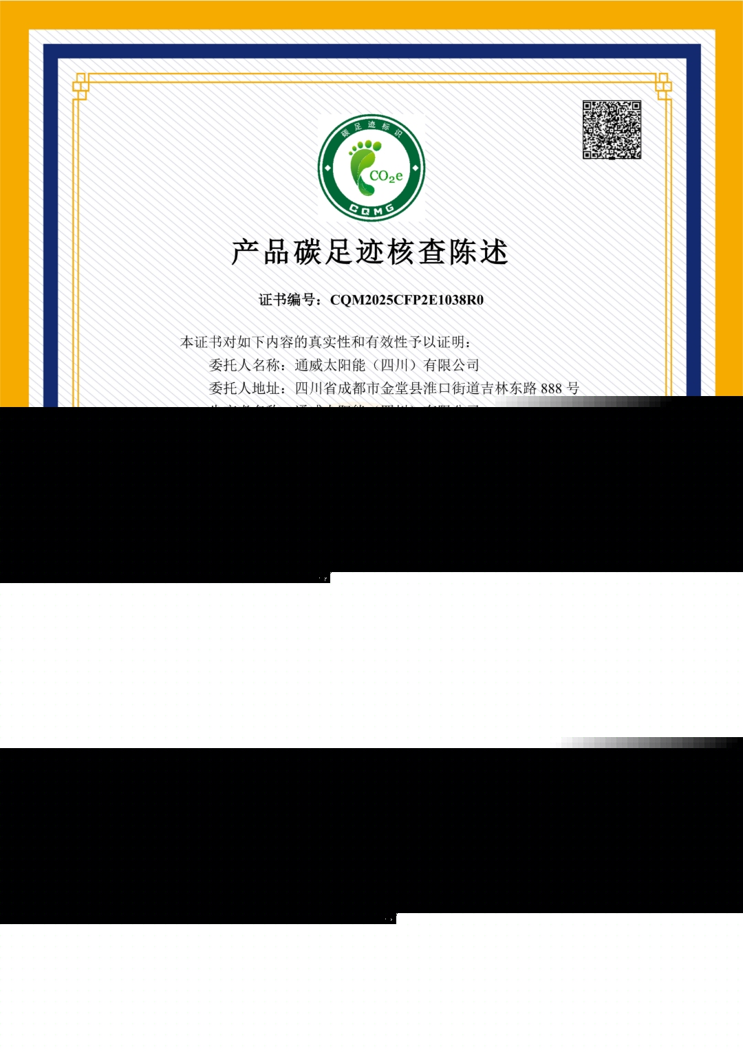 通威太陽能科技金堂基地榮獲ISO 14067產品碳足跡核查證書