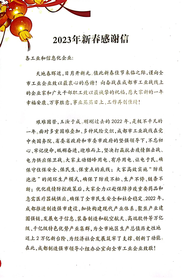 成都制造強(qiáng)市領(lǐng)導(dǎo)小組辦公室發(fā)來感謝信鼓勵通威太陽能再創(chuàng)佳績