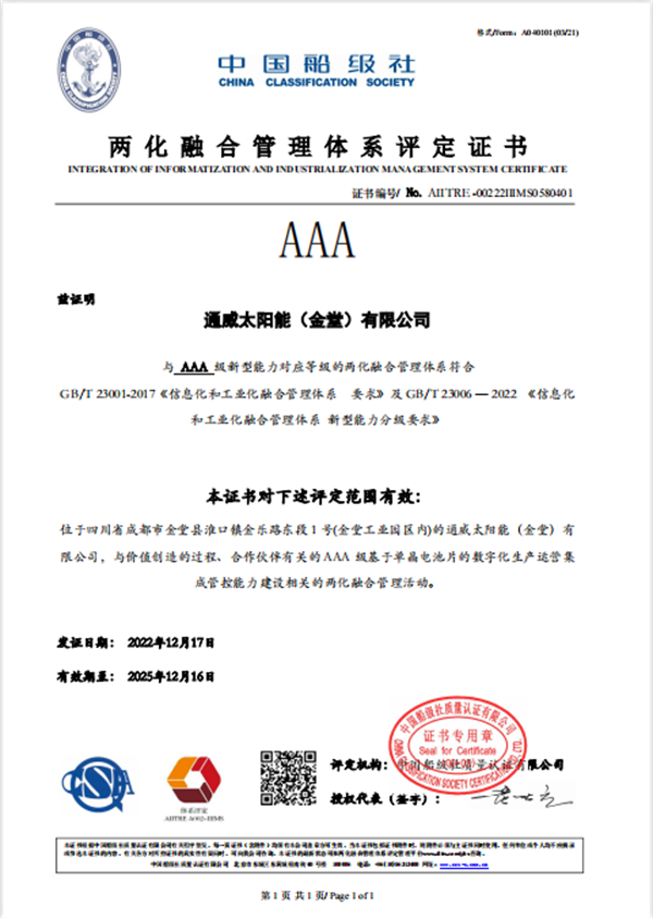 通威太陽能金堂基地順利通過國家兩化融合管理體系貫標(biāo)AAA級評定