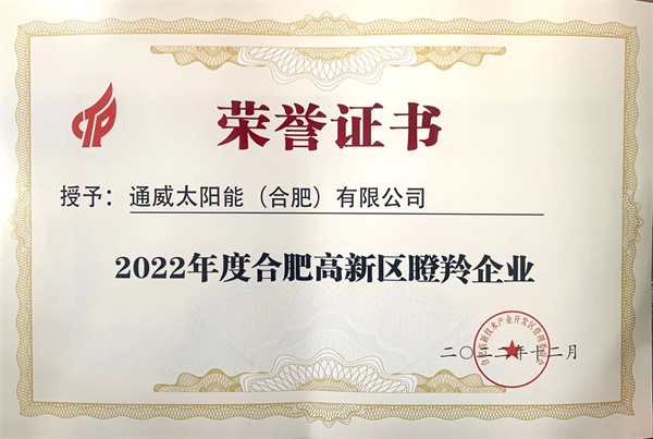 通威太陽能(合肥)有限公司榮獲2022年度合肥高新區(qū)瞪羚企業(yè)稱號
