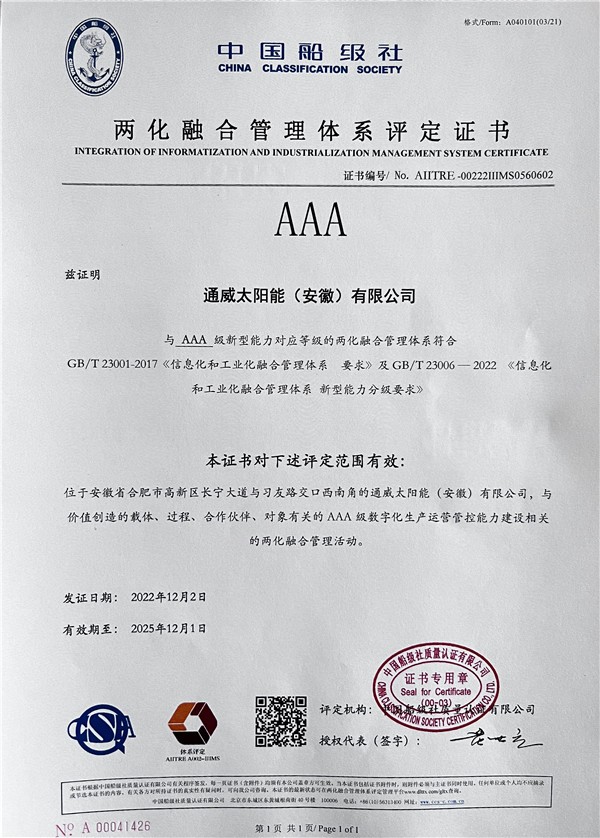 通威太陽能(安徽)有限公司順利通過國家兩化融合管理體系貫標評定AAA級評定