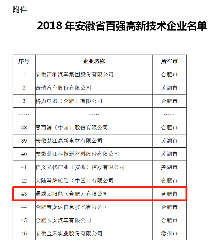 通威太陽能入圍2018年安徽省百強高新技術企業名單