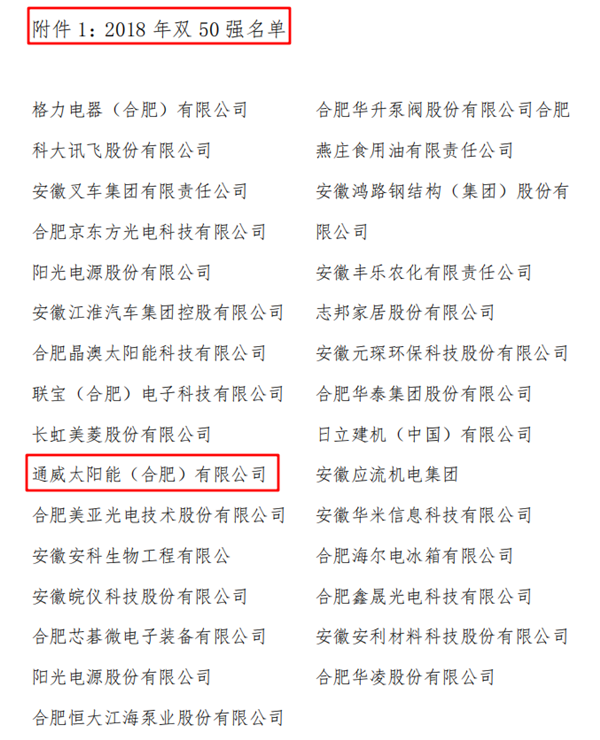 通威太陽能榮列“2018年度安徽省制造業(yè)綜合實力雙50強”榜單
