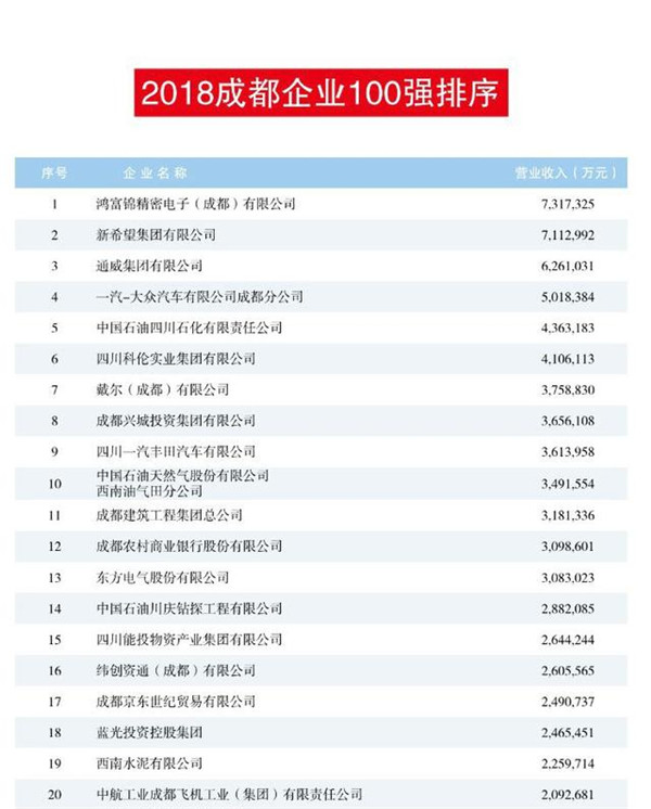 通威集團榮列“2018成都企業100強”前三強