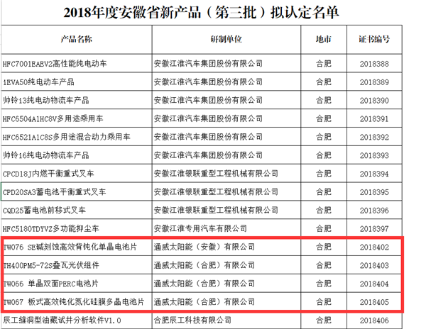 通威太陽能合肥公司新增4項省級新產品