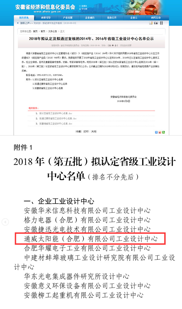 通威太陽(yáng)能(合肥)有限公司榮列2018年擬認(rèn)定省級(jí)工業(yè)設(shè)計(jì)中心公示名單