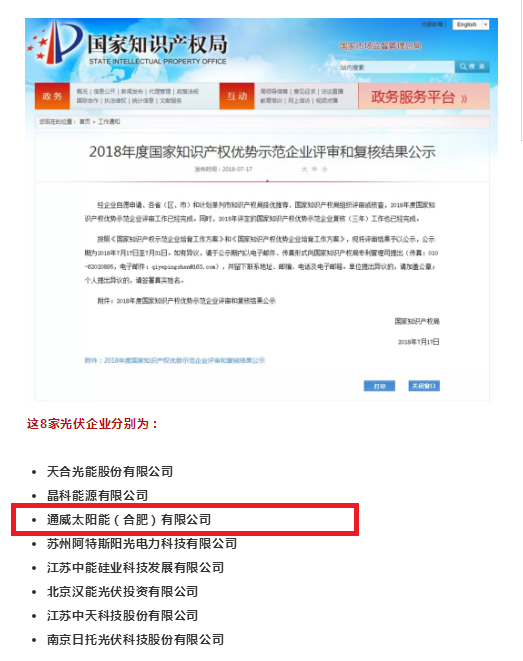 通威太陽能榮列2018年度國家知識產權優勢示范企業公示名單