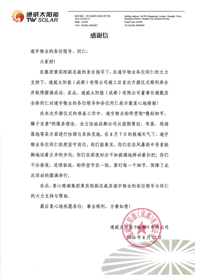 通宇物業(yè)獲通威太陽(yáng)能(成都)有限公司感謝信表?yè)P(yáng)