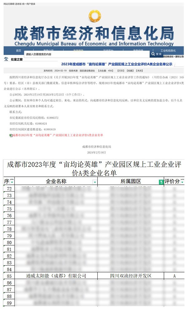 通威太陽能雙流基地、眉山基地、通合項目分別榮列2023年度“畝均論英雄”產(chǎn)業(yè)園區(qū)規(guī)上工業(yè)企業(yè)評價A類企業(yè)