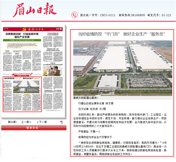 《眉山日報》聚焦通威太陽能眉山基地疫情防控與安全生產
