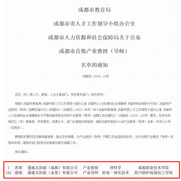 近日,市教育局、市人才辦、市人社局、市財政局聯合發文公布成都市首批131名產業教授(導師)名單,通威太陽能2名相關領域專家成功入選。