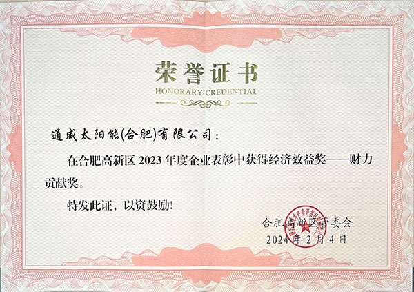 通威太陽能(合肥)有限公司獲得高新區經濟效益獎——工業財力貢獻前十名