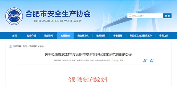 “2023年度合肥市安全管理標(biāo)準(zhǔn)化示范班組”的公示