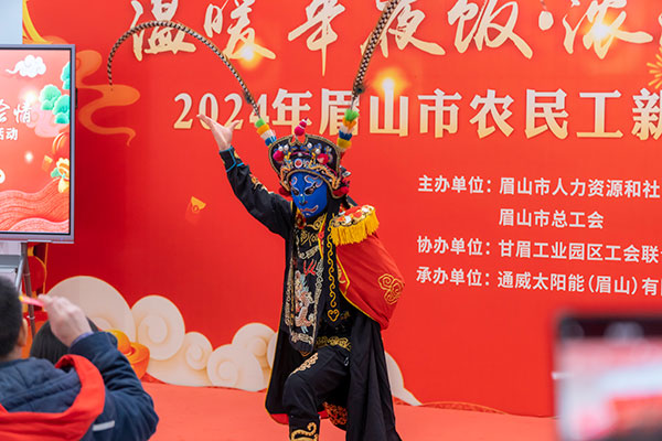 活動(dòng)現(xiàn)場(chǎng)氣氛熱烈而溫馨,洋溢著歡樂祥和的節(jié)日氛圍。大家齊聚一堂,共同欣賞川劇變臉、歌唱表演、詩歌朗誦等精彩節(jié)目,品嘗豐盛的年夜飯。同時(shí),市總工會(huì)、市人社領(lǐng)導(dǎo)還現(xiàn)場(chǎng)為農(nóng)民工代表們發(fā)放了慰問品,向辛勤工作在崗位一線的農(nóng)民工們致以最誠摯的祝福和最溫暖的關(guān)懷。