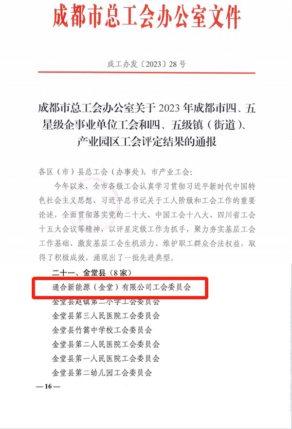 近日,成都市總工會發(fā)布《成工辦發(fā)〔2023〕28號成都市總工會辦公室關(guān)于2023年成都市四、五星級企事業(yè)單位工會和四、五級鎮(zhèn)(街道)、產(chǎn)業(yè)園區(qū)工會評定結(jié)果的通報》,其中,通合新能源工會被成都市總工會評為“2023年成都市四星級工會”。