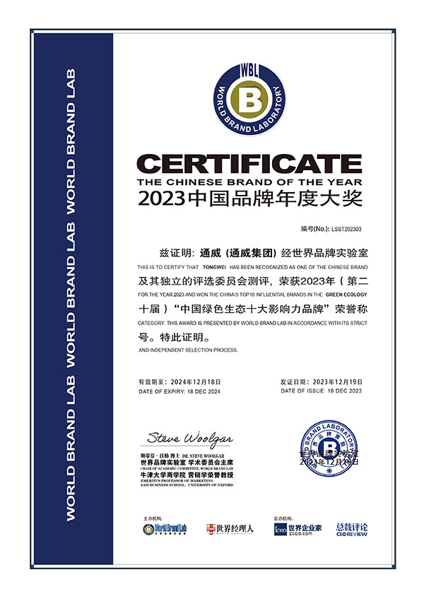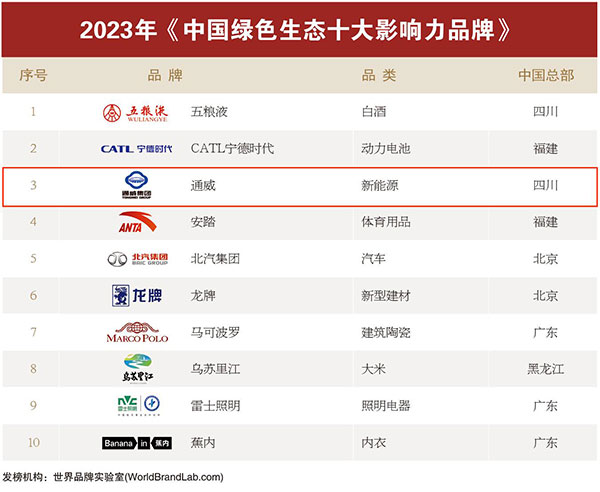 世界品牌實驗室今年特別推出中國知識產權、中國公益、中國科技創新和中國綠色生態十大影響力品牌,以此褒獎那些注重技術研發與創新、積極履行社會責任和可持續發展的優秀品牌。通威榮列“中國綠色生態十大影響力品牌”榜單,充分彰顯了通威對推動綠色可持續發展作出的重要貢獻。