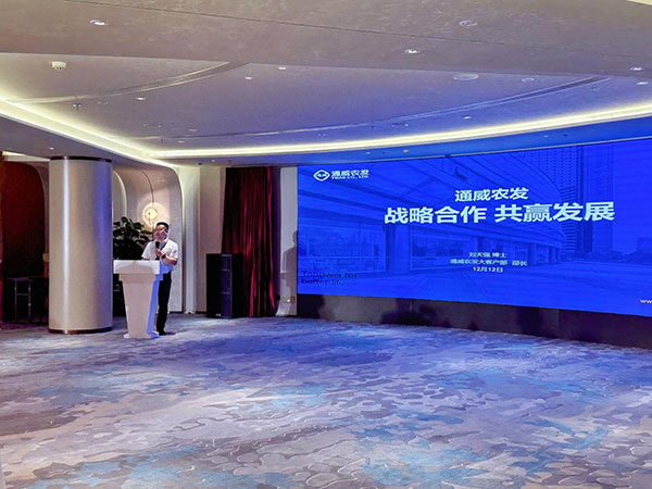 論壇上,劉天強(qiáng)博士分享了《戰(zhàn)略合作 共贏發(fā)展》主題報(bào)告。通威發(fā)端于水產(chǎn),成長(zhǎng)于農(nóng)牧,并于今年正式邁入“世界500強(qiáng)”的行列。發(fā)展至今,通威堅(jiān)持為用戶創(chuàng)造價(jià)值,企業(yè)才能持續(xù)發(fā)展的生存之道。劉博士從技術(shù)優(yōu)勢(shì)、原料優(yōu)勢(shì)、品質(zhì)管控、保障服務(wù)和產(chǎn)品特色五方面對(duì)通威產(chǎn)品做了詳細(xì)介紹,讓在場(chǎng)嘉賓對(duì)通威有了更深的了解。
