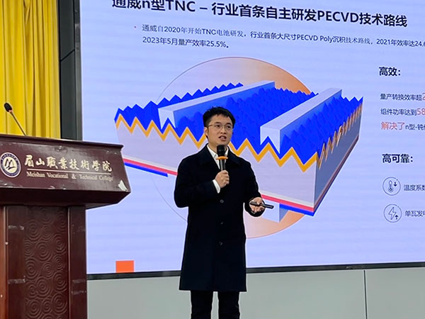 授課現(xiàn)場(chǎng),姚騫總團(tuán)隊(duì)以《通威TNC電池技術(shù)與優(yōu)勢(shì)分析》為題,圍繞太陽(yáng)能電池技術(shù)展開分享,深入淺出地講解了科技創(chuàng)新的魅力和通威N型TNC電池技術(shù)的先進(jìn)性,闡述了每一次原創(chuàng)技術(shù)的產(chǎn)生都是經(jīng)過(guò)數(shù)不清的實(shí)驗(yàn)測(cè)試。堅(jiān)持不懈的科技工作者精神是每一位科技工作者應(yīng)具備的基本素養(yǎng)。姚騫總鼓勵(lì)同學(xué)們一定要認(rèn)真學(xué)習(xí),打好學(xué)習(xí)基礎(chǔ),不斷進(jìn)步,希望通過(guò)授課可以培養(yǎng)同學(xué)們科技創(chuàng)新的信念,將來(lái)為家鄉(xiāng)建設(shè)添磚加瓦。