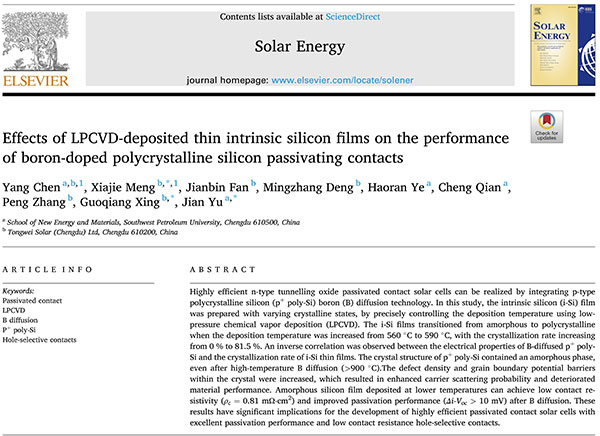 在不斷追求太陽能技術(shù)創(chuàng)新的道路上,通威太陽能再次取得了令人振奮的突破性成果。10月11日,通威太陽能產(chǎn)學(xué)研合作成果在國際知名學(xué)術(shù)期刊《Solar Energy》發(fā)表,題為“Effects of LPCVD-deposited thin intrinsic silicon films on the performance of boron-doped polycrystalline silicon passivating contacts”。