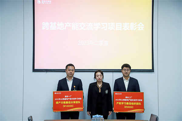 第二期“跨基地產能學習活動”中共有8個學習代表團隊參加,共計輸出139項改善建議,已按規范提報18項提產項目,提報項目在2023年年內累計提產量預計可達6,362萬片,通合新能源各廠部及個人,主動學習積極作為,在各學習代表團隊中以優異的表現和突出成果脫穎而出。根據《產能學習及賦能激勵辦法》評選:電池一廠榮獲“提產方案最佳分享團隊”,電池二廠榮獲“產能學習最佳組織團隊”。