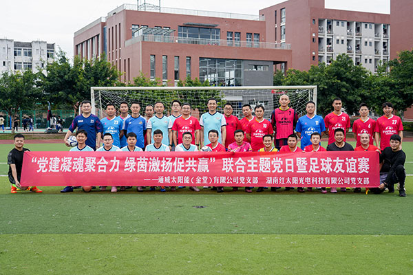 為豐富黨員職工群眾的業(yè)余文化生活,增進與黨建共建單位的溝通交流,10月13日,通威太陽能金堂基地黨支部與湖南紅太陽光電科技有限公司黨支部開展了“黨建凝魂聚合力 綠茵激揚促共贏”聯(lián)合主題黨日暨足球友誼賽。紅太陽光電公司董事長肖昕、金堂基地黨支部書記、總經(jīng)理助理龐三鳳分別帶領(lǐng)公司代表隊出戰(zhàn)。