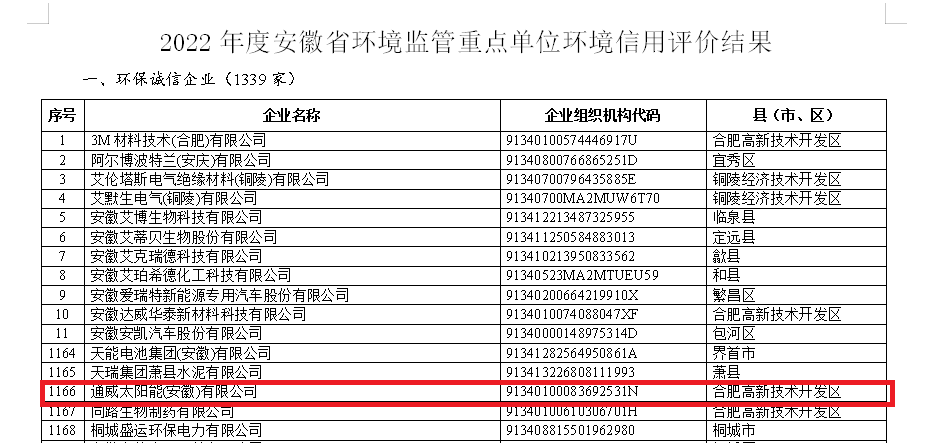 通威太陽能安徽公司榮列“2022年度安徽省環(huán)保誠信企業(yè)”榜單