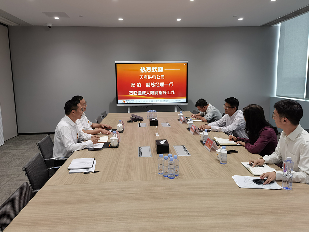 9月26日,國網天府供電公司副總經理張凌一行蒞臨通威太陽能雙流基地交流指導,通威太陽能雙流基地總經理助理徐濤熱情接待并座談。