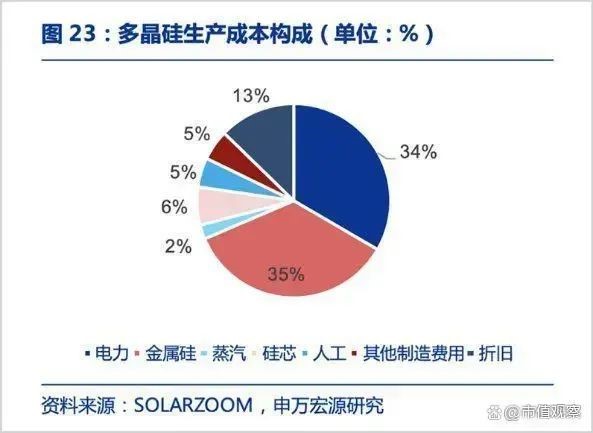 拆解硅料生產(chǎn)成本,電力、金屬硅、蒸汽、硅芯、人工、其他制造費(fèi)用、折舊占比分別為34%、35%、2%、6%、5%、5%、13%。其中,電力、硅粉和折舊占比最高。