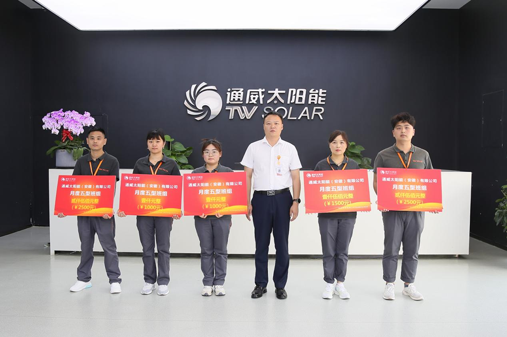 為全面提升一線班組的凝聚力、戰斗力,建設技能型、效益型、管理型、創新型、和諧型的五型太陽能制造團隊,同時培養標桿,樹立典范,激勵全體班組不斷進步、不斷超越,持續營造比、學、趕、幫、超的良好團隊氛圍8,通威太陽能順利開展7月月度五型班組表彰活動,通威太陽能各基地負責人出席頒獎活動分別為各優秀班組頒發榮譽
