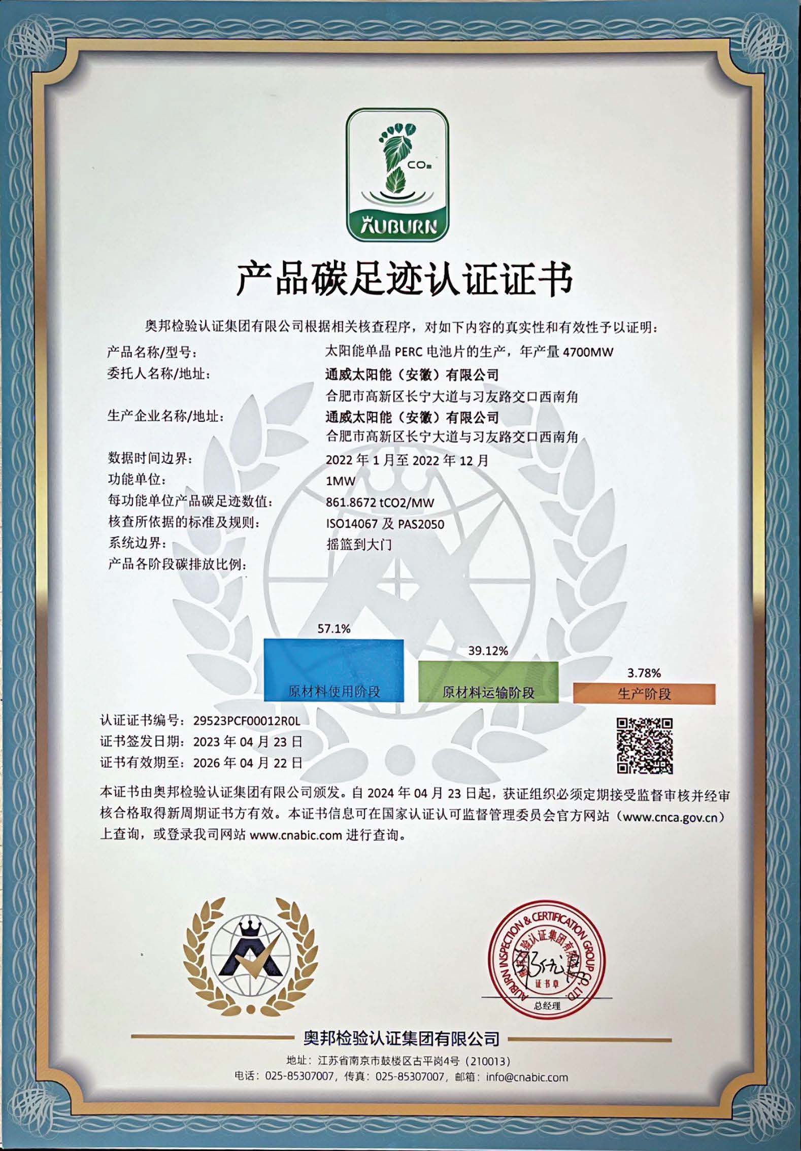 通威太陽能(安徽)有限公司產品產品碳足跡、溫室氣體核查披露