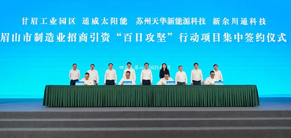 7月10日,眉山市制造業招商引資“百日攻堅”行動項目集中簽約儀式舉行。眉山市委書記胡元坤,市委副書記、市政府市長黃河,市委常委、市政府常務副市長孫劍,市委常委、統戰部部長魯力,市政府副市長鄒汝林和市政府相關部門負責人出席會議。眉山天府新區、各縣(區)相關工作負責人,甘眉工業園區黨工委、管委會班子成員及相關部門負責人參加會議。通威股份董事長、CEO劉舒琪,通威太陽能總經理周華,副總經理宋梟作為簽約企業代表受邀出席,并與甘眉工業園區正式簽署了《通威太陽能有限公司16GW高效晶硅電池項目投資協議書》。