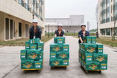 員工代表將禮盒運送至各發放點位