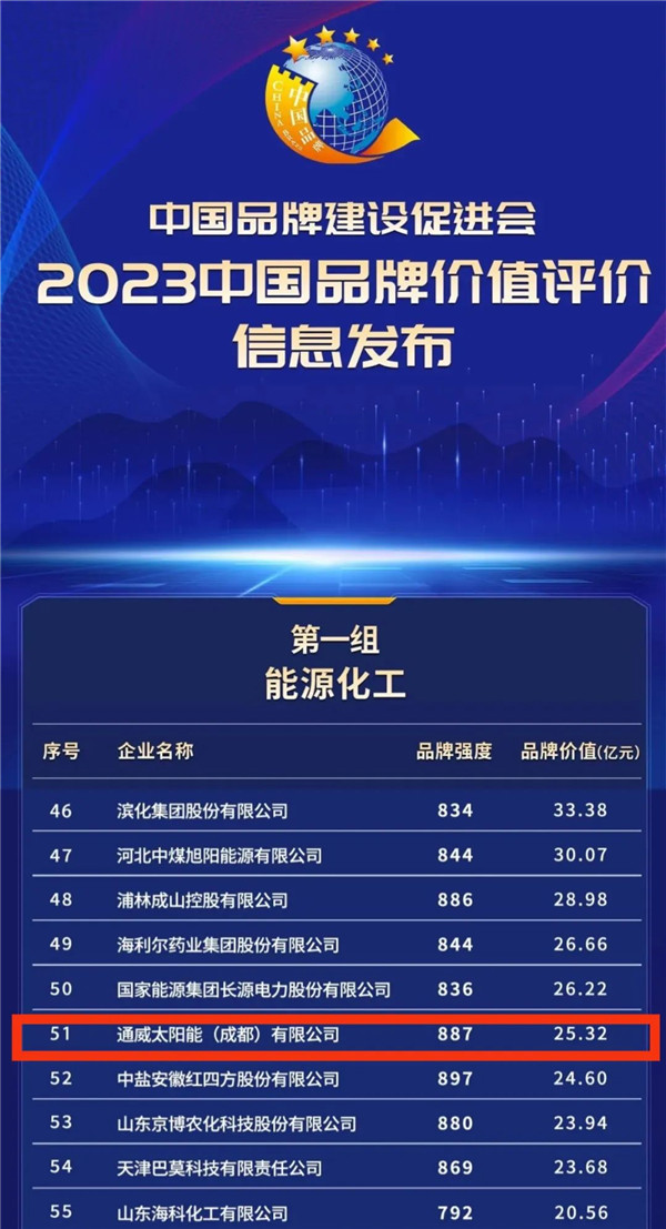 通威太陽能雙流基地位列2023中國品牌價(jià)值評價(jià)“能源化工”組榜單第51位
