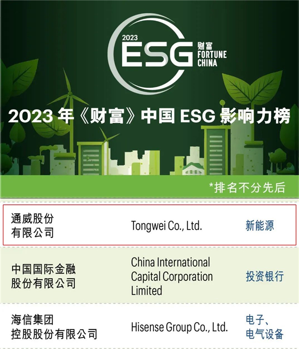 5月5日,2023年《財富》中國ESG影響力榜單揭曉,通威股份憑借在可持續(xù)治理、應(yīng)對氣候變化、科技創(chuàng)新、可持續(xù)供應(yīng)鏈、員工發(fā)展等方面的優(yōu)秀ESG實踐,成功榮登該榜單。