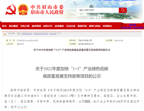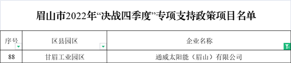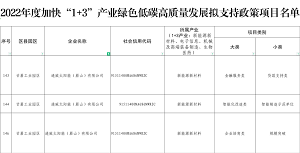 3月中旬,中共眉山市委市政府官方網站公示完成了《關于2022年度加快“1+3”產業綠色低碳高質量發展支持政策項目名單》及《眉山市2022年“決戰四季度”專項支持政策項目名單》,通威太陽能眉山基地經自主申報,縣(區)及園區推薦、專家評審、現場核查等程序,成功榮列以上名單,在“智能化改造、企業培育、金融服務、增產增效”等方面獲得相關政策支持。