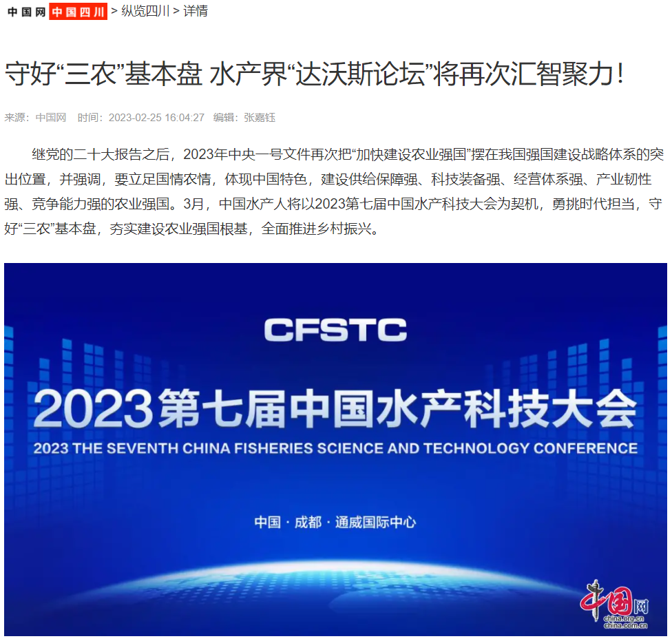 3月,有著“水產(chǎn)界‘達(dá)沃斯論壇’”美譽(yù)的中國(guó)水產(chǎn)科技大會(huì),將在成都通威國(guó)際中心迎來(lái)第七屆的舉辦。過去六年,人民網(wǎng)、新華網(wǎng)等上百家主流權(quán)威媒體及行業(yè)媒體對(duì)大會(huì)關(guān)注報(bào)道,以最佳角度、更大廣度、更高深度展現(xiàn)水產(chǎn)科技發(fā)展成果,傳遞中國(guó)水產(chǎn)人的擔(dān)當(dāng)強(qiáng)音。今年,人民網(wǎng)、央廣網(wǎng)、中國(guó)網(wǎng)、中國(guó)新聞網(wǎng)等再次相繼聚焦,為大會(huì)貫徹落實(shí)中央“全面推進(jìn)鄉(xiāng)村振興、加快建設(shè)農(nóng)業(yè)強(qiáng)國(guó)”文件精神造勢(shì)聚氣。