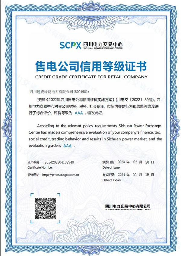 信用是市場的基礎。習近平總書記強調,要完善社會信用等市場經濟基礎制度,為各類經營主體投資創業營造良好環境,激發各類經營主體活力。作為通威集團旗下綜合能源服務商,四川通威綠能電力有限公司始終秉持“誠、信、正、一”的經營理念,在四川電力交易中心對全川售電公司的信用評價中喜獲AAA這一最高評級,全川僅有2%的售電公司獲此殊榮。
