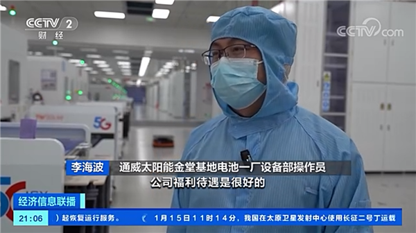 《央視財經》報道指出:熱火朝天的生產場景正在上映,數百臺智能小車來回穿梭運輸物料,一片片灰色硅片經過制絨、刻蝕、鍍膜等工序成為電池片。當問到春節期間留班人員福利待遇時,通威太陽能金堂基地總經理助理龐三鳳說道:“春節期間會結合我們實際生產的情況進行輪班,對留崗員工有一些福利,除夕到初二這三天每天人均是五百塊錢,初三和初四,除了兩倍工資之外,還有三百塊錢的一個補貼。”李海波是設備維護崗的一位操作員,聽說工廠今年春節不停產后,他主動申請留崗加班,他告訴記者,自己是本地人,回家比較方便,再加上公司額外的補貼比較高,準備這段時間把錢掙夠,等工友們回來后,自己再錯峰休假。