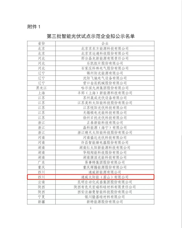 1月10日,國家工業(yè)和信息化部網(wǎng)站完成了對《智能光伏試點(diǎn)示范》企業(yè)名單(第三批)的公示,作為全球光伏行業(yè)智能制造樣板和示范企業(yè),通威太陽能眉山基地榮列榜單。