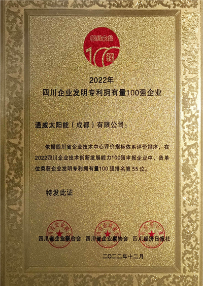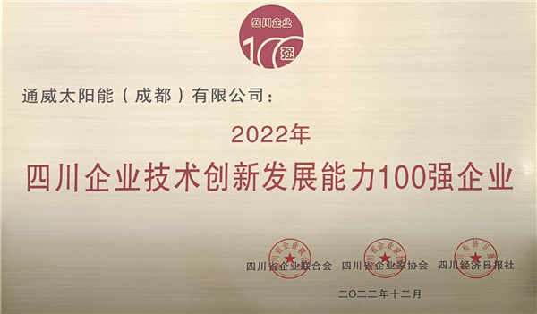 2022年12月29日,四川企業(yè)技術(shù)創(chuàng)新發(fā)展大會(huì)在成都舉行,會(huì)上發(fā)布了2022年四川企業(yè)技術(shù)創(chuàng)新發(fā)展能力100強(qiáng)、四川企業(yè)技術(shù)創(chuàng)新發(fā)展最具潛力20強(qiáng)、四川企業(yè)發(fā)明專利擁有量100強(qiáng)及四川企業(yè)技術(shù)創(chuàng)新突出貢獻(xiàn)人物等榜單,通威太陽能成功榮獲“2022年四川企業(yè)技術(shù)創(chuàng)新發(fā)展能力100強(qiáng)企業(yè)”第7位及“2022年四川企業(yè)發(fā)明專利擁有量100強(qiáng)企業(yè)”第55位,其中技術(shù)創(chuàng)新發(fā)展能力名次較上年攀升了8位,發(fā)明專利擁有量名次較上年攀升了15位。