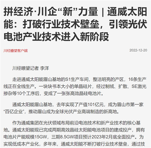 12月20日,四川經濟日報發表題為“拼經濟·川企‘新’力量|通威太陽能:打破行業技術壁壘,引領光伏電池產業技術進入新階段”的報道,聚焦通威太陽能在技術領域的創新與發展。