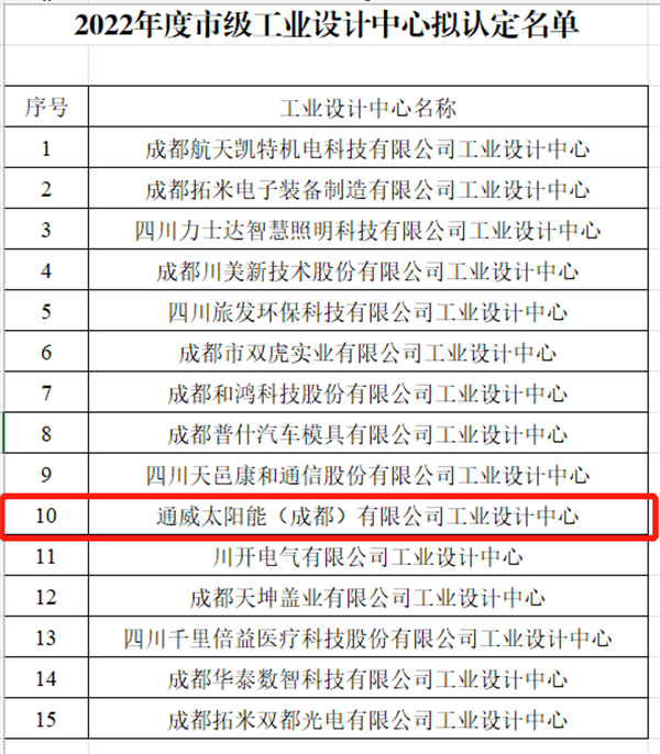 近日,由成都市經(jīng)濟(jì)和信息化局組織開(kāi)展2022成都市認(rèn)定工業(yè)設(shè)計(jì)中心工作順利結(jié)束,并公布了“2022年成都市市級(jí)工業(yè)設(shè)計(jì)中心名單”,通威太陽(yáng)能雙流基地榮列其中,這是公司首次獲得工業(yè)設(shè)計(jì)中心”方面的權(quán)威認(rèn)證。