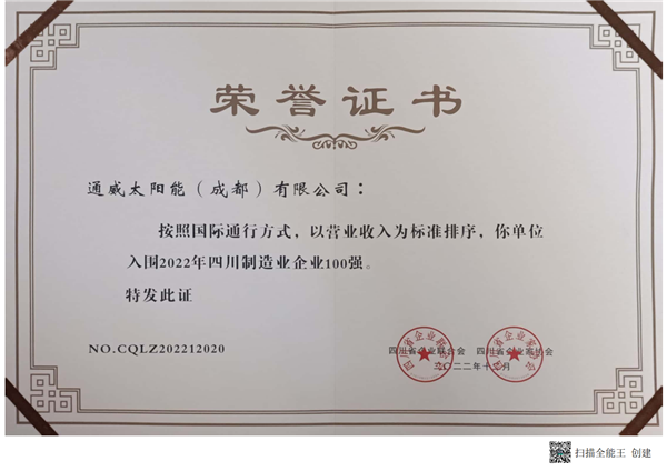 通威太陽能“2022年四川制造業(yè)百強(qiáng)企業(yè)”證書