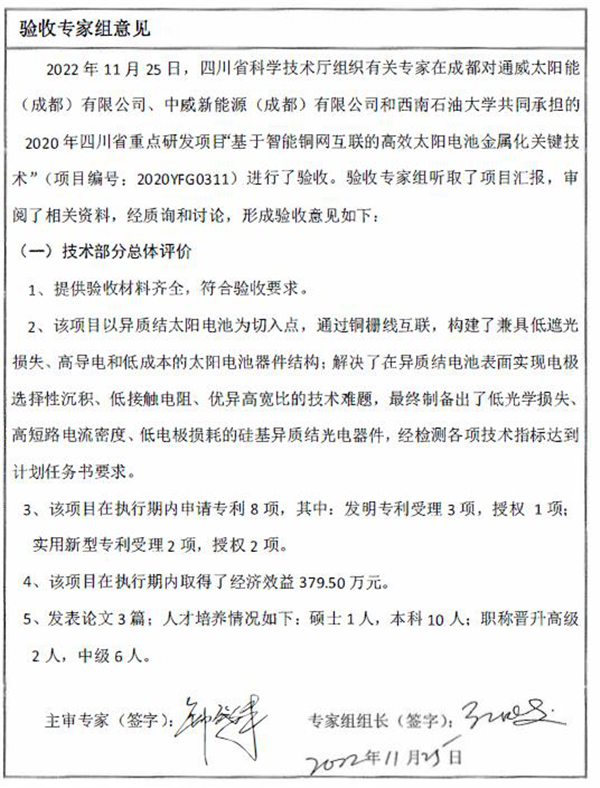 11月25日,四川省科學(xué)技術(shù)廳組織專家組對(duì)通威太陽(yáng)能雙流基地承擔(dān)的“四川省重點(diǎn)研發(fā)項(xiàng)目”進(jìn)行驗(yàn)收并順利通過。