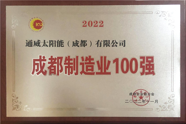 近日,由成都市經濟和信息化局指導,成都市企業聯合會主辦的“2022成都企業100強”發布會在成都舉行,會上發布了“成都企業100強”“成都制造業企業100強”“成都民營企業100強”“成都服務業企業100強”等四個100強榜單,通威太陽能雙流基地榮獲“2022成都制造業百強企業”稱號。
